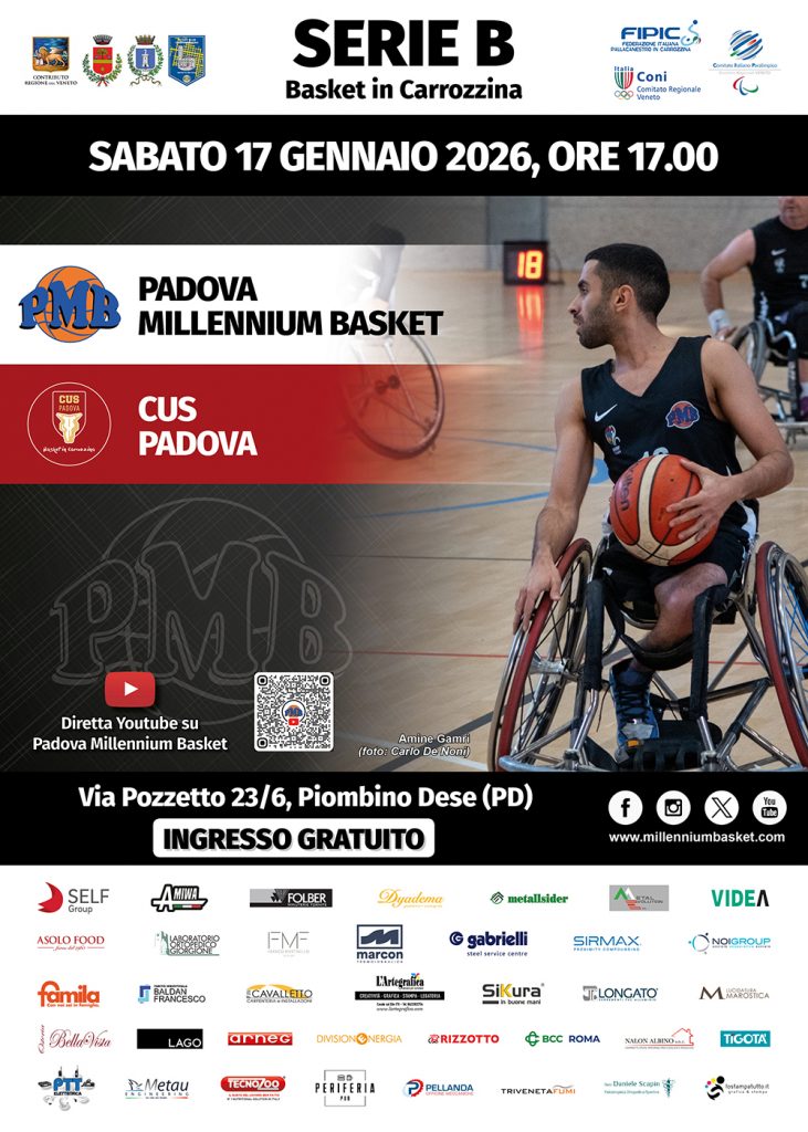 Riparte dal derby padovano la serie di gare casalinghe del Padova Millennium Basket, opposto al CUS Padova nella prima sfida del 2026 fra le mura amiche. L’appuntamento è per sabato 17 gennaio alle ore 17.00, al palasport di Via Pozzetto 23/6 a Piombino Dese, con ingresso gratuito.
